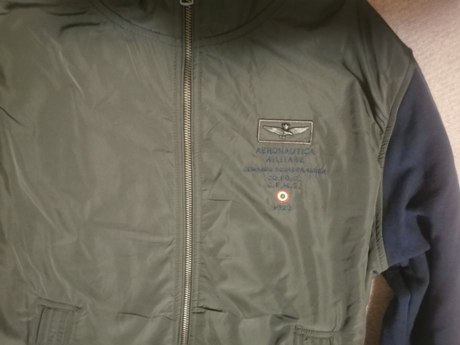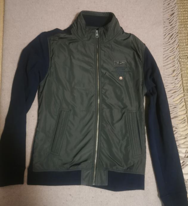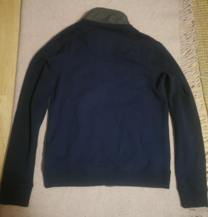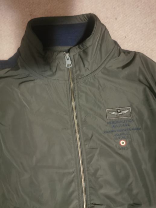 Aeronautica Militare prijelazna jakna vesta sweatshirt sa patent zatvaračem napravljena od pamučno i naylonskog dijela. Maksimalno očuvana 10 /10 bez tragova nošenja. Ima dva đepa sa strane. Boja ove sweetshirt jakne je tamnoplave boje na rukavima i leđima i sivomaslinasta boje na prednjoj strani jakne koja je napravljena od naylonske membrane. Pa daje zanimljivu kvalitetnu sweetshirts proljetnu jaknu.