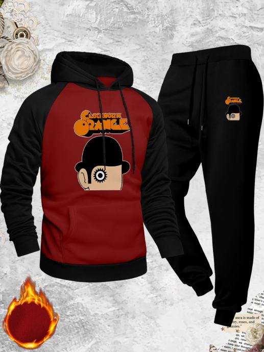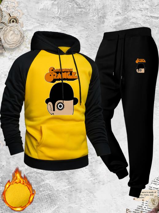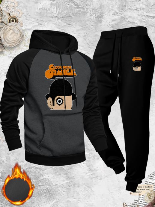 Muški ležerni sportski dvodijelni set s raglan rukavima i kapuljačom, pulover u dvobojnim blokovima s printom "Paklena naranča" i moderne svestrane jogger hlače