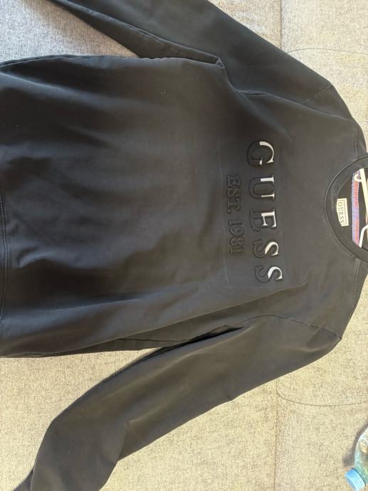 Prodajem Guess duksu u crnoj boji, veličina M. Na prednjoj strani nalazi se izvezen Guess logo s natpisom "Est. 1981". Muški kroj, dugi rukavi.