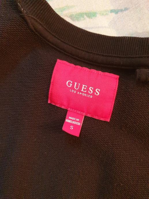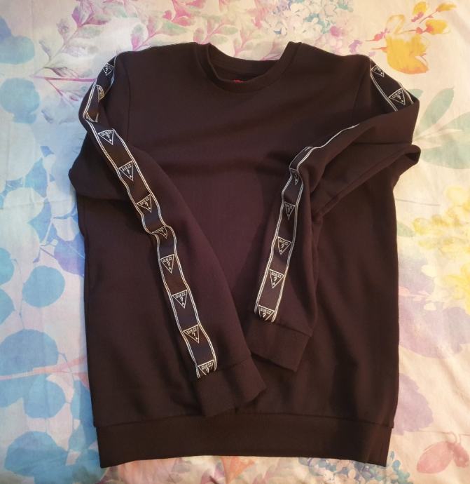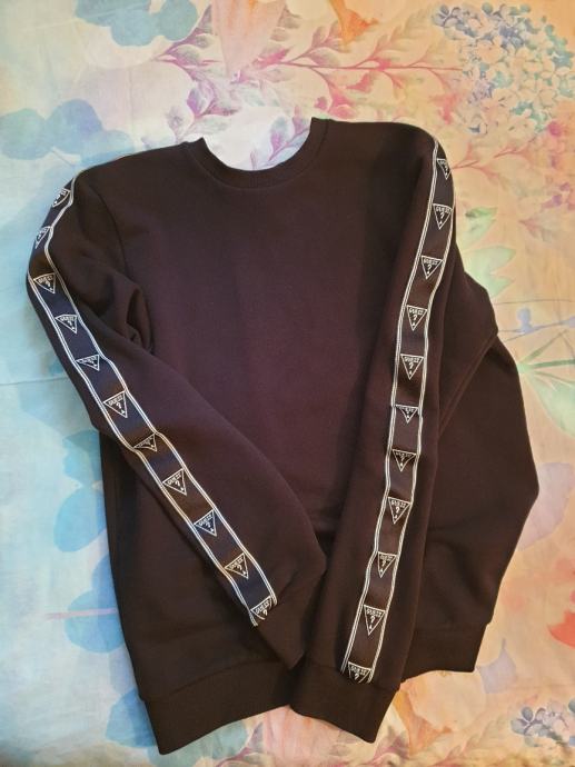 Original, crna crew neck majica s trakom po rubu rukava s malim guess logo-ima. Par puta nošeno, stanje besprijekorno. Pamuk. Muški broj S, ženski barem 40. Moguće slanje i primopredaja.