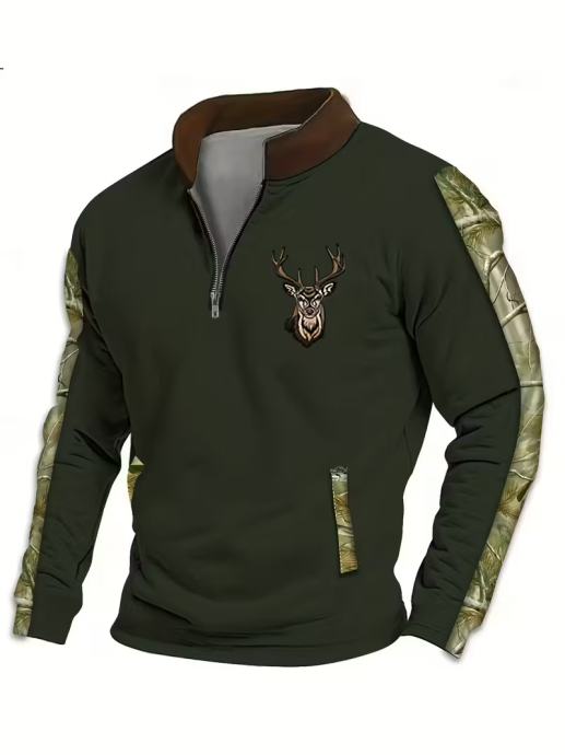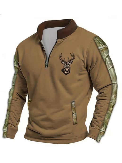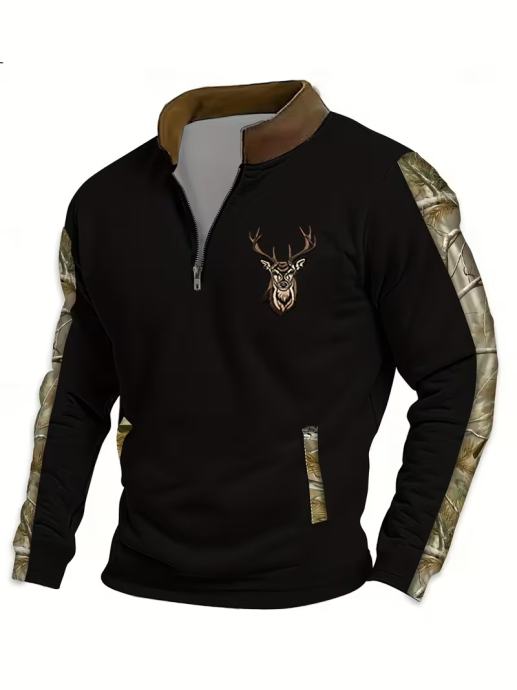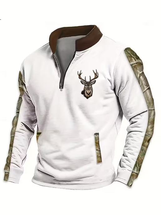 Majica s ovratnikom i patentnim zatvaračem u europskom i američkom stilu, izrađena od udobne i otporne na gužvanje tkanine, s printom glave jelena i patchworkom, savršena za ležerno nošenje na otvorenom, moderan izbor za muške topove