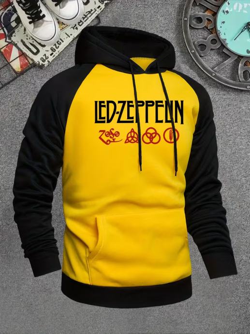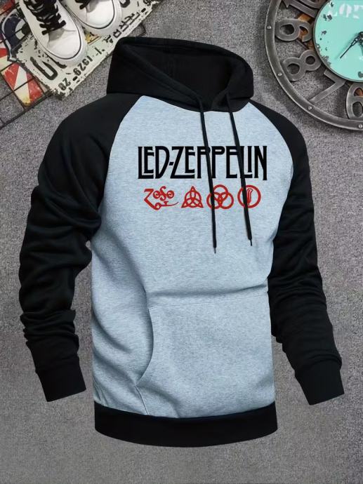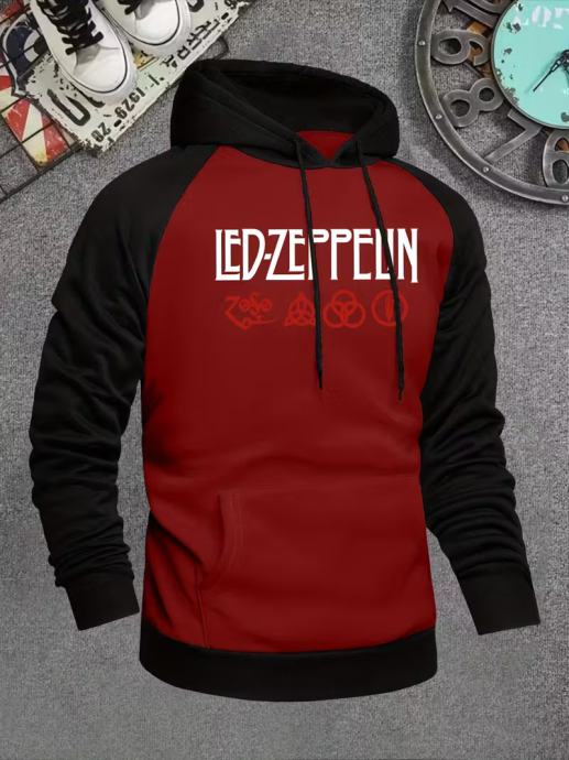 Muška LED Zeppelin grafička majica s kapuljačom - crno-crveni patchwork dizajn, ležerna majica s džepovima, dugi rukavi, regularni kroj, jesensko/zimska moda, ležerna majica s kapuljačom | Hoodie s grafičkim printom | Udoban kroj hoodie