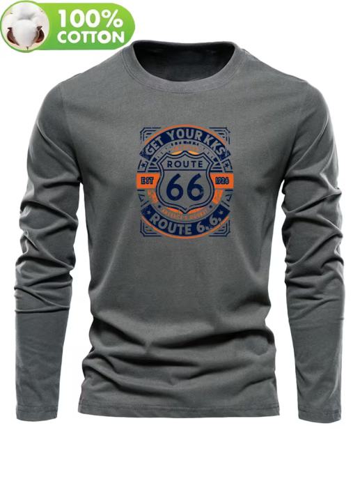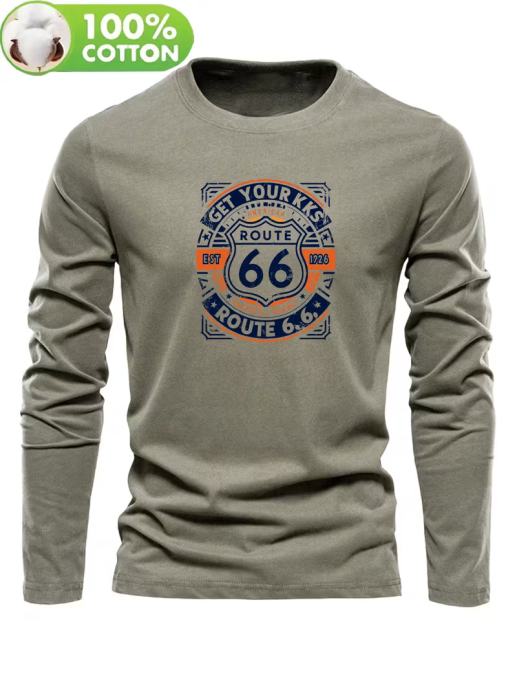Muška majica dugih rukava od 100% pamuka s retro logotipom Route 66 i vintage printom iz 1966. - Ležerna, okrugli izrez, regularni kroj, proljeće/jesen, slojevito odijevanje, neophodno, Road Trip i Americana stil (siva) - Ležerna odjeća inspirirana 1960-ima