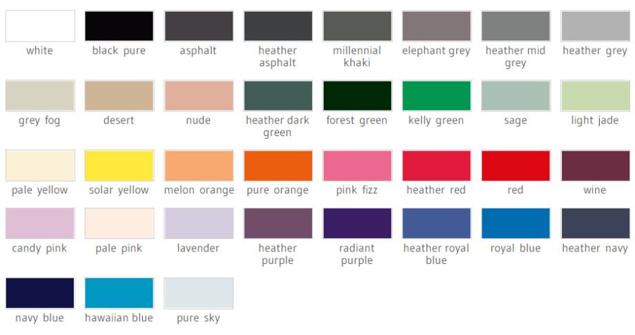 • 80% pamuk obrađen prethodnim kuhanjem i češljanjem, 20% poliester (heather boje: 60% pamuk, 40% poliester; heather grey: 92% pamuk, 8% viskoza)