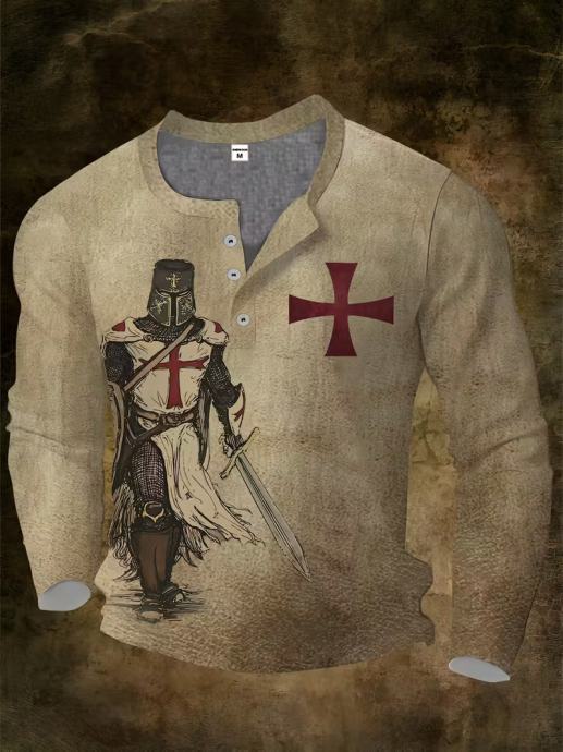 Muška majica srednjovjekovnog viteza - Dugi rukavi s printom viteza i srednjovjekovnim dizajnom preko cijelog tijela, okrugli izrez i kopčanje na gumbe sprijeda, zimska odjeća periva u perilici rublja za renesansne sajmove, tematske događaje i ležernu odjeću - Odjeća za povijesne igre uloga s opuštenim krojem i detaljima na gumbe po cijeloj dužini, idealna za jesensko/zimsku sezonu, elegantna i udobna za ležernu odjeću