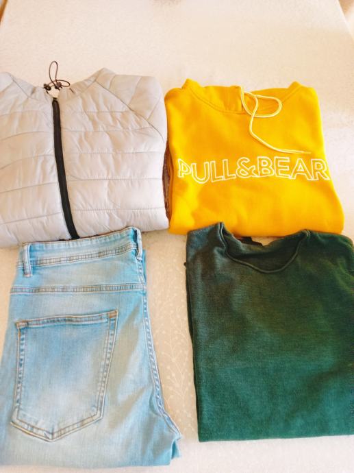 Lot odjeće za mladiće. Majica s kapuljačom, senf boja, veličina M, PUUL&BEAR. Tamno zelena vesta, M veličina, New Yorker. Siva jakna za prijelazno razdoblje, M veličina, Bershka. Traperice, veličina 34/32, New Yorker. Kratko nošeno, očuvano.