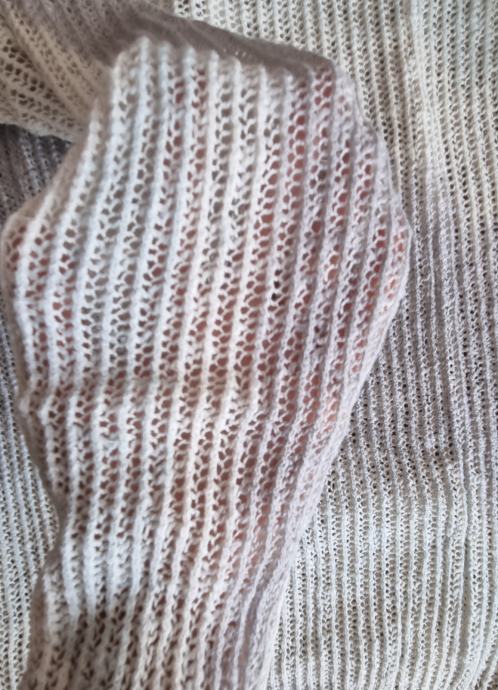 Tekstura: Izrađen je od blago poluprozirne/ rupičaste tkanine s ne prozirnim, rebrastim rubovima (donji rub ispod struka i rubovi rukava)