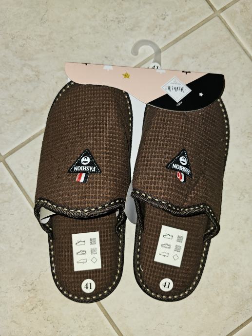 Nove muške papuče smeđe boje s etiketom, veličine 41. Udobne i kvalitetno izrađene s teksturiranim dizajnom i kontrastnim šavovima. Savršene za svakodnevno nošenje po kući.