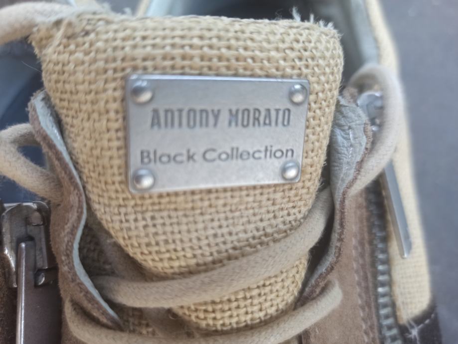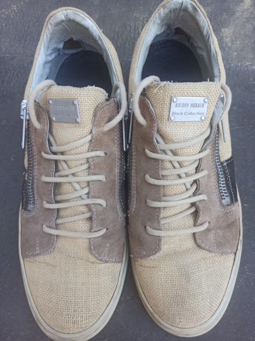 - Antony Morato "Black Collection" - Vrlo dobro stanje. Veličina 45, ali je manji kalup pa je to klasični 44.5 za stopalo od 29 cm. Nedostatak na peti s unutarnje strane vidljiv na zadnjoj fotki --- 6€