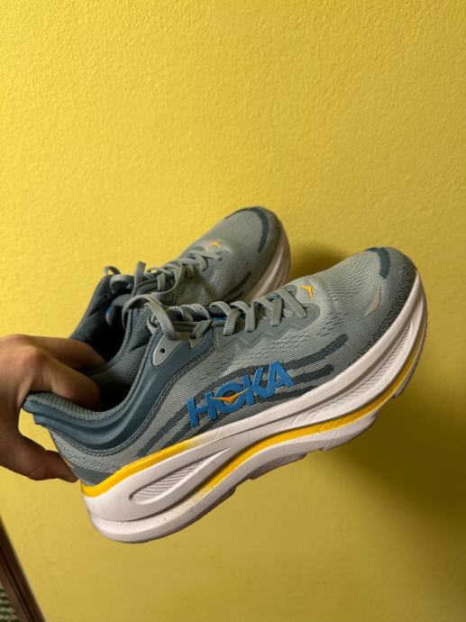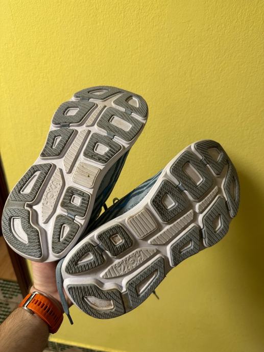 Prodajem Hoka Bondi 9 muške tenisice u plavoj boji, veličina 43.5. Tenisice su poznate po svojoj izvrsnoj amortizaciji i udobnosti. Bondi 9 ima debeli međupotplat koji pruža maksimalnu zaštitu stopala, što ih čini idealnim za duže šetnje i trčanje. Potplat je u odličnom stanju s vidljivim gazištem.