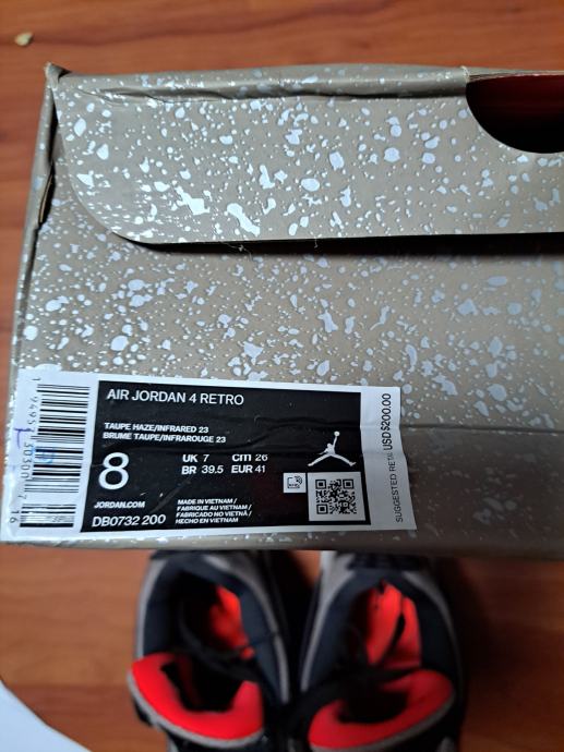 Jordan 4 taupe haze br. 41, nenošeno, potpuno novo, kupljeno s računom kod provjerenog trgovca.