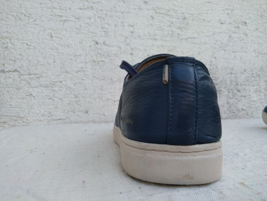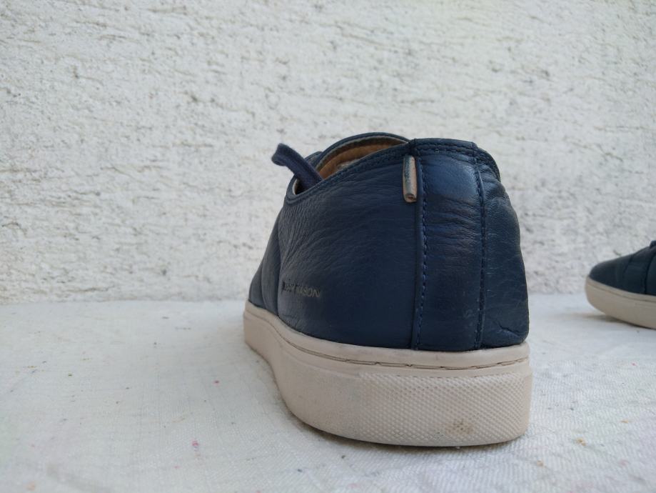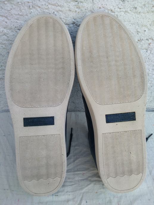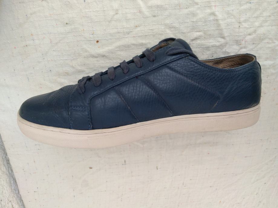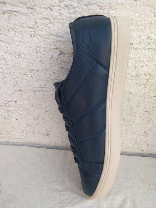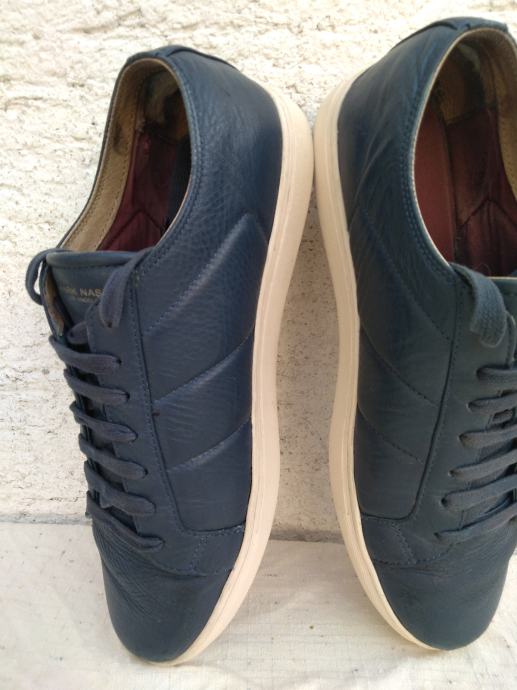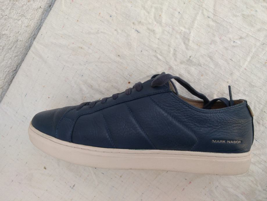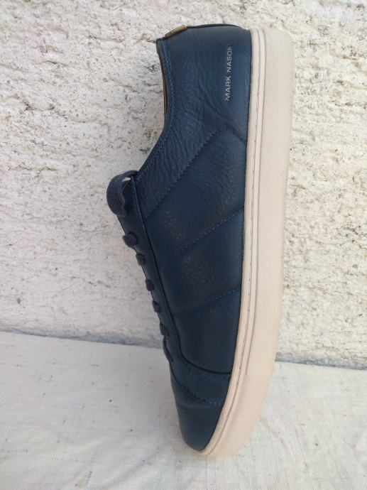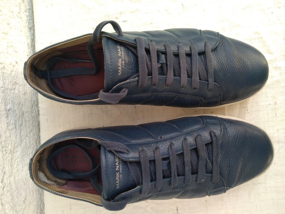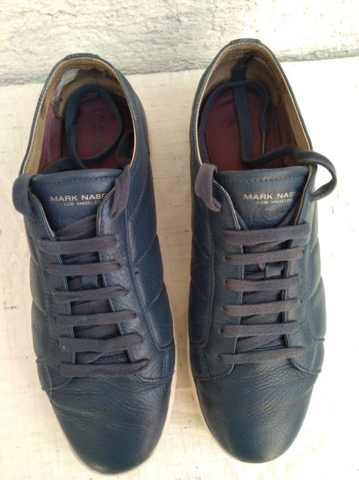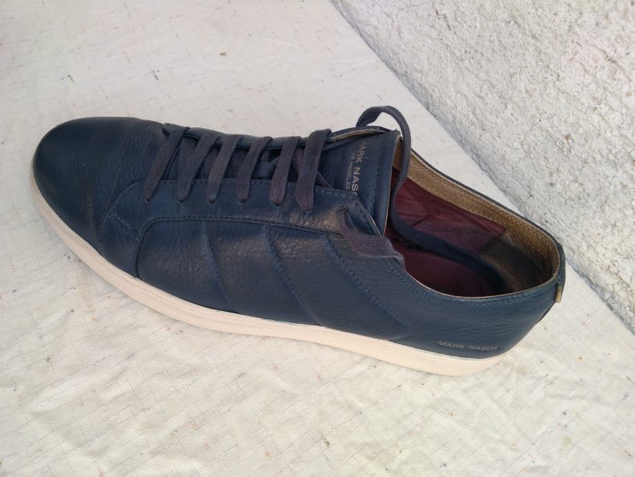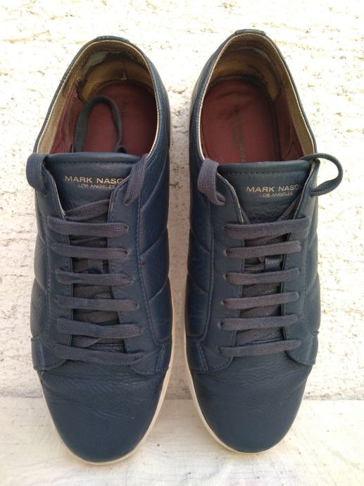 Mark Nason Los Angeles muške tenisice - sportske cipele made in Vietnam original EUR 46/US 12/UK 11 sa mekim un utarnjim gazištem dužine 30 cm: eksterijer prava koža tamno plavi lak, interijer rubovi, jezik i petni dio koža....ravni đonovi debljine 30 mm prošivani uz gornjište- gumirani hodni sloj......sve u izvrsnom stanju osim malo izlizana koža petnog dijela interijera.......