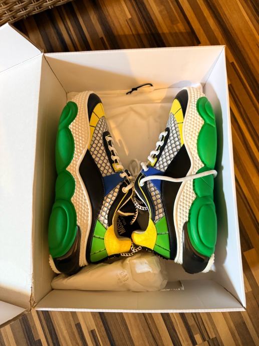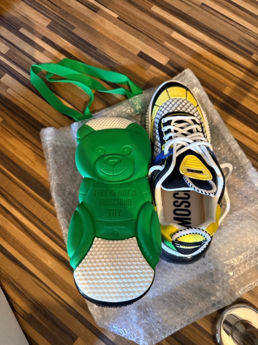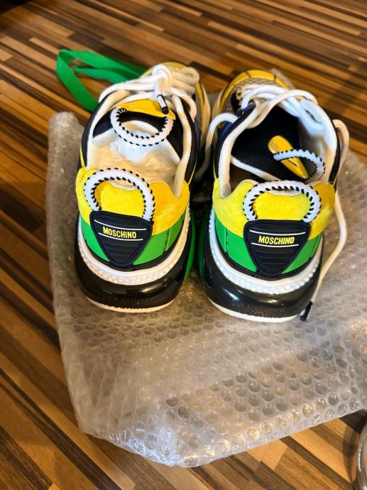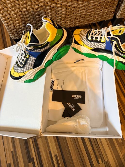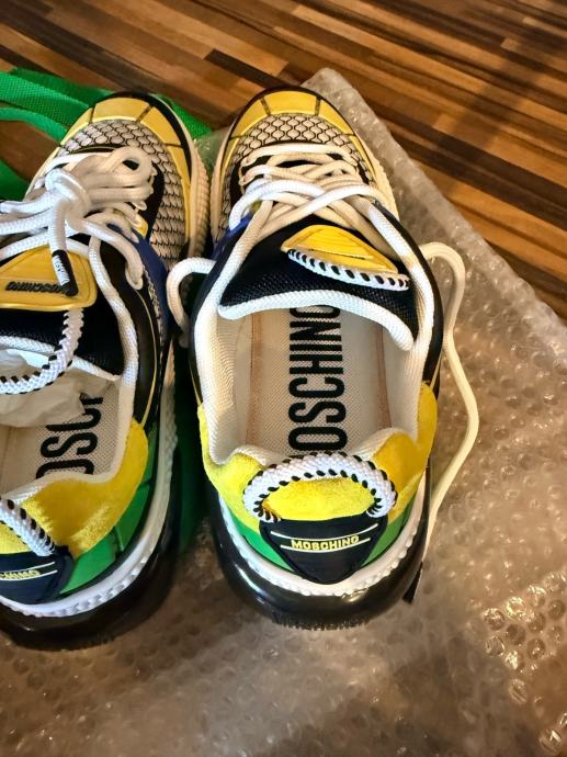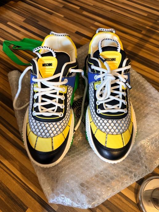 Ove Moschino tenisice imaju višebojne mrežaste panele s dizajnom panela u boji. Ove niske tenisice također imaju logotip na jeziku, logotip straga, prednje kopčanje na vezice, jezičak za povlačenje na peti, uložak s jastučićima, zaštitni znak na peti, debeli gumeni potplat i okrugli vrh.