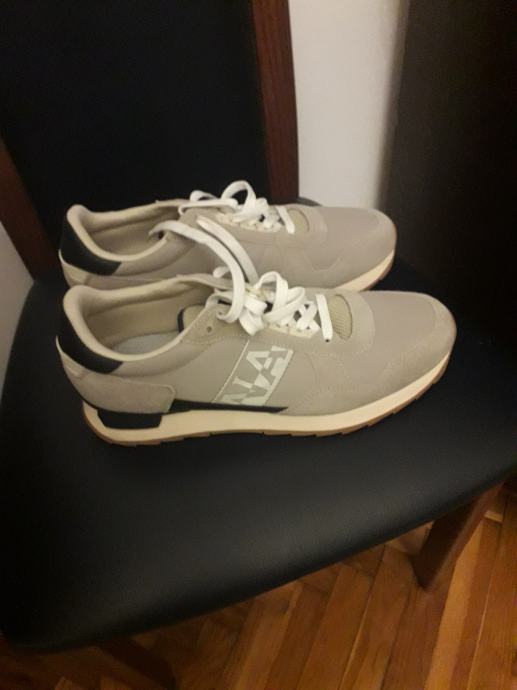Prodajem rabljene muške tenisice veličine 43 izrađene od kože. Tenisice su nježne bež boje s tamnim detaljima i bijelim logom na bočnoj strani. Udobne su i odlično očuvane s minimalnim znakovima korištenja.