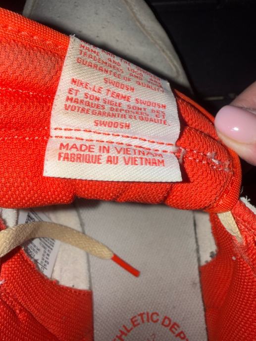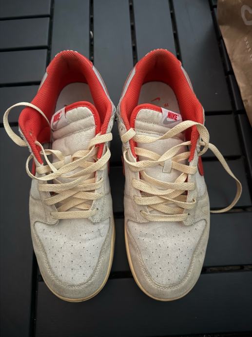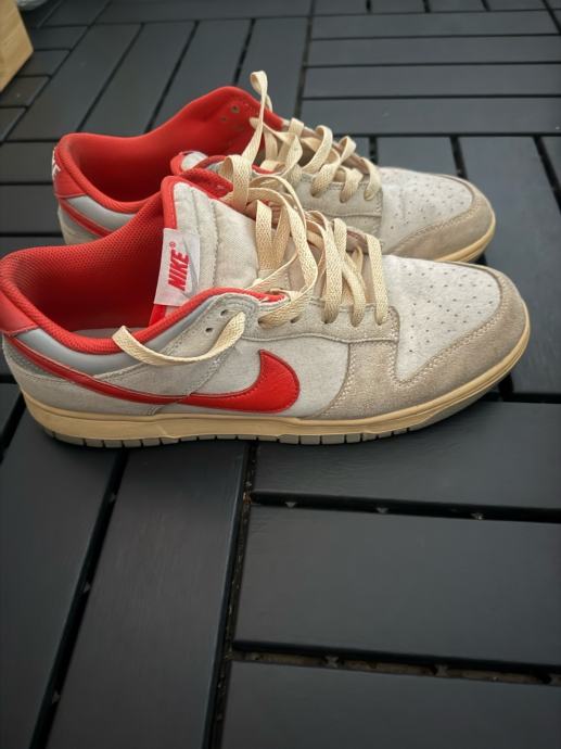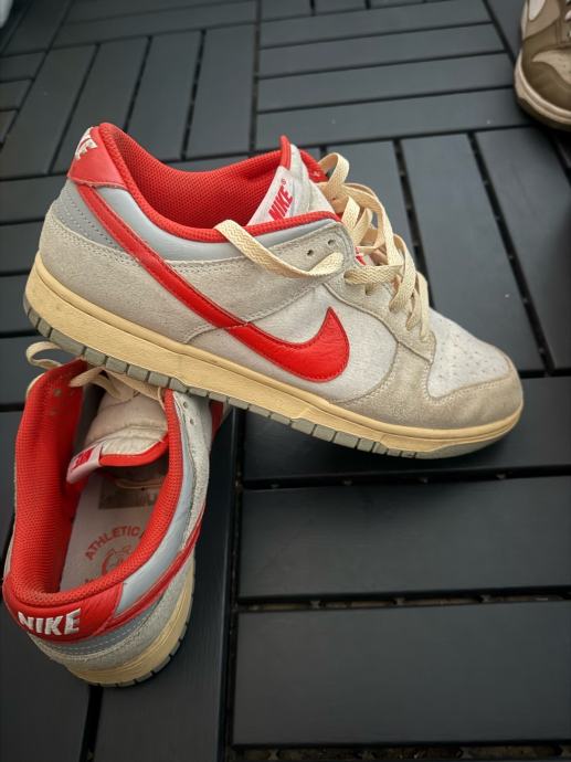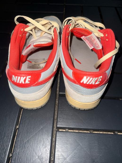Prodajem Nike Dunk muške tenisice u veličini 45. Model ima kombinaciju bijele i sive boje s crvenim Nike swoosh logom i crvenim detaljima na peti i obrubu. Nošene su i oprane, nema oštećenja.