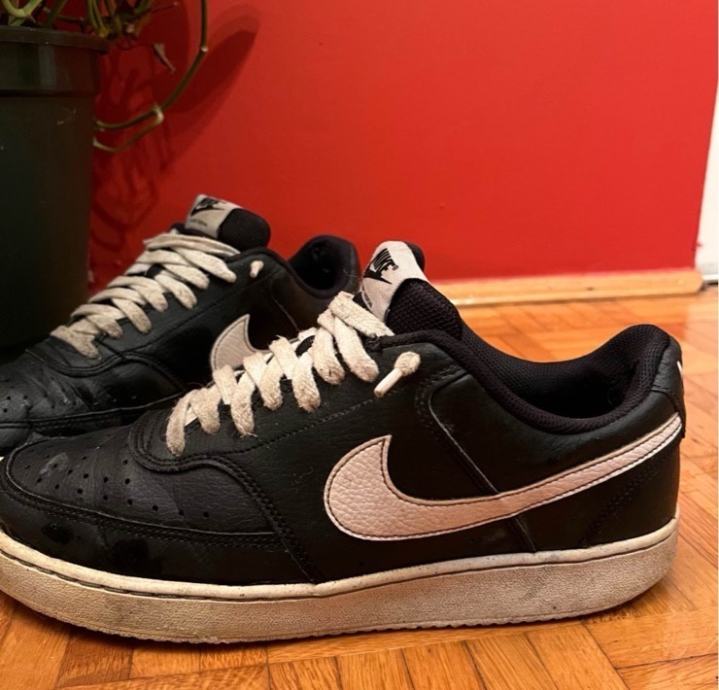 Prodajem Nike tenisice u crnoj boji, veličina 44. Gornji dio tenisice izrađen je od kože, što im daje kvalitetniji izgled i trajnost. Tenisice imaju klasičan Nike dizajn s bijelim detaljima i bijelim đonom.