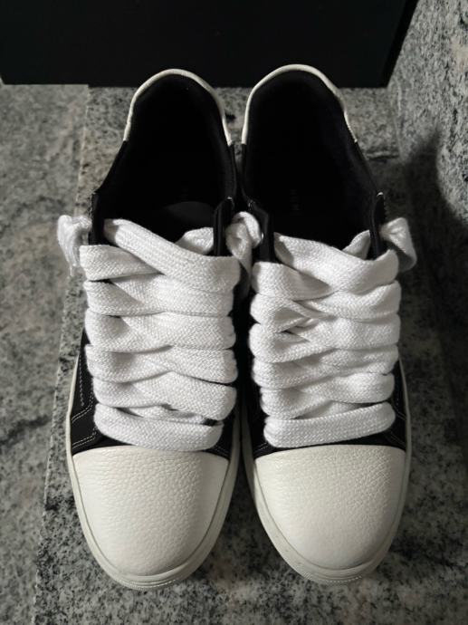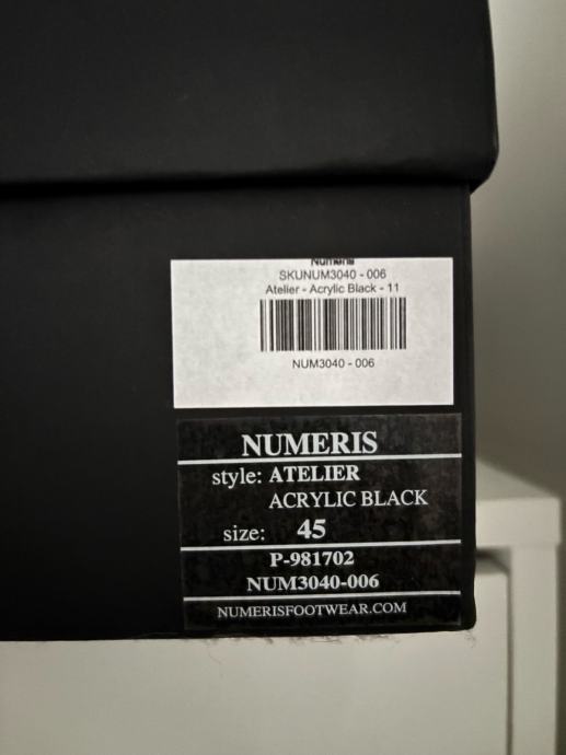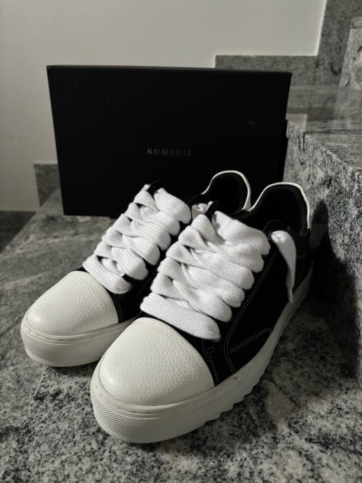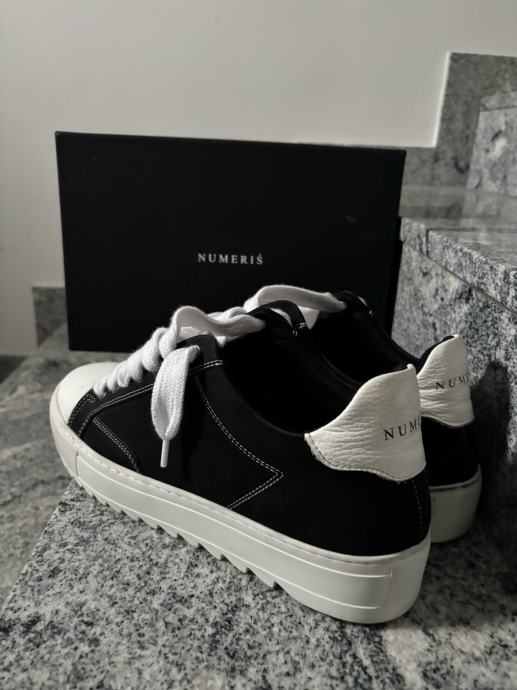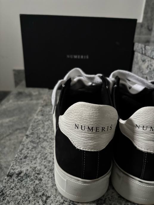 Prodajem originalne Numeris tenisice, nove, broj 45. Crne su boje s bijelim detaljima – bijeli vrhovi, bijeli potplat i bijele vezice koje daju tenisicama specifičan, upečatljiv izgled. Gornji dio izrađen je od kombinacije tekstila i kože, a na jezičcu i peti vidljiv je logo brenda. Dolaze s originalnom kutijom. Razlog prodaje je premala veličina.