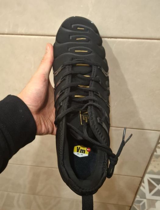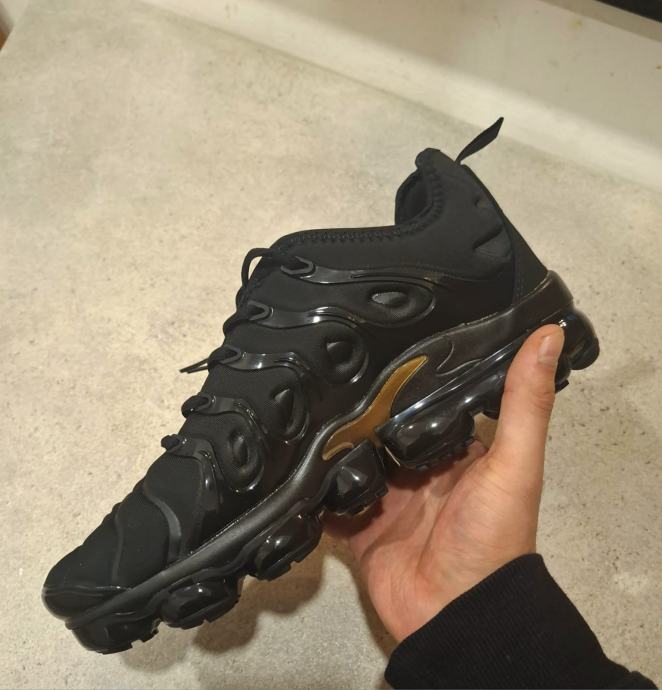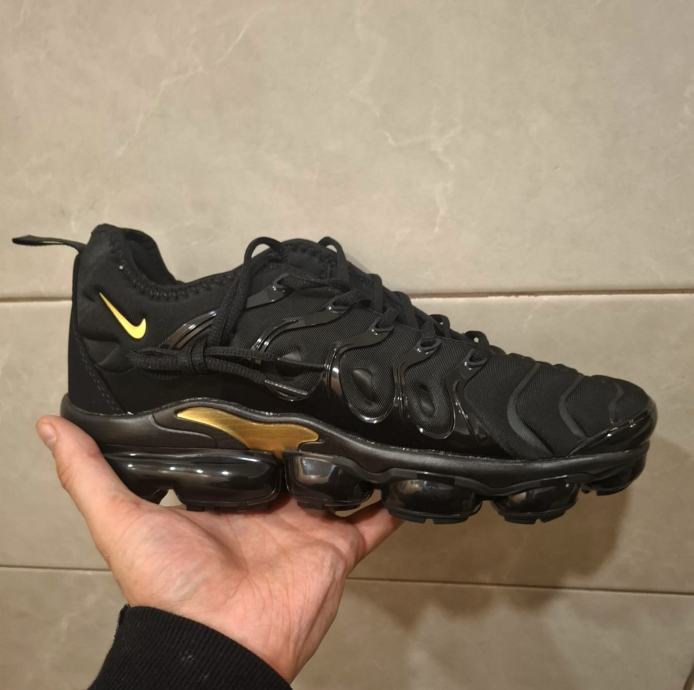 Prodajem potpuno nove Nike VaporMax Plus tenisice u crno-zlatnoj kombinaciji, veličine 44, još uvijek s etiketom. Ove moderne muške tenisice odlikuju se prepoznatljivim dizajnom s transparentnim zračnim potplatom i zlatnim detaljima koji dodaju elegantan dodir. Idealne su za urbani stil i svakodnevno nošenje, a dolaze u originalnoj kutiji.