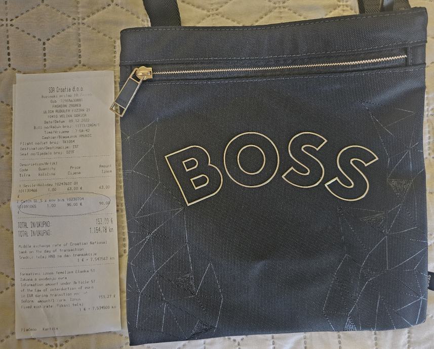 HUGO BOSS nova muška torbica. Dimenzije 23x24 cm, glavni pretinac s patentom i prednji manji s patentom. Nova, bez etikete. Za nošenje preko ramena ili crossbody sa podesivim remenom. Kupljena na Zg aerodromu, placena 90 EUR.