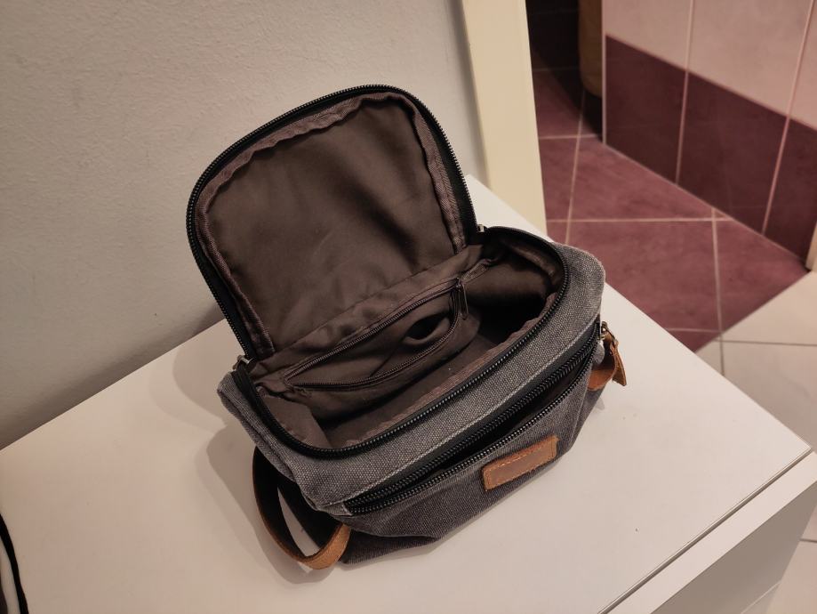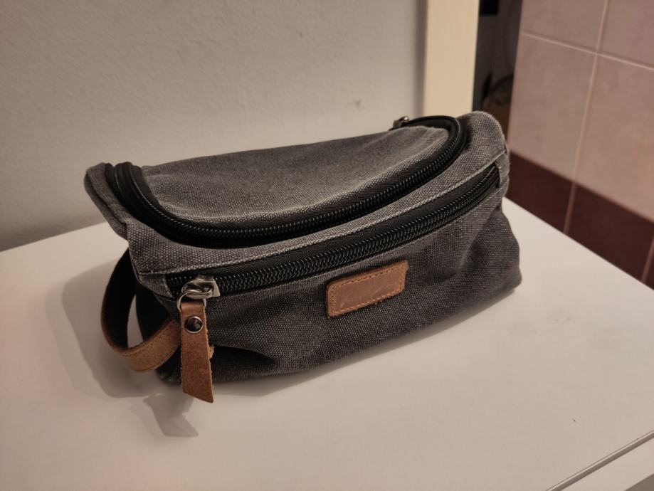 Prodajem kozmetičku torbicu, odnosno neseser od sive kanvas tkanine s detaljima od smeđe umjetne kože. Torbica se otvara velikim patentnim zatvaračem na vrhu, a ima i dodatni džep na prednjem dijelu, također zatvoren patentom. Unutrašnjost je prostrana, s nekoliko pregrada i držačima za sitnice, što omogućuje uredno odlaganje kozmetike i toaletnih potrepština. Na bočnim stranama nalaze se smeđe kožne ručice za nošenje. Solidne je veličine, praktična za putovanja ili svakodnevnu upotrebu.