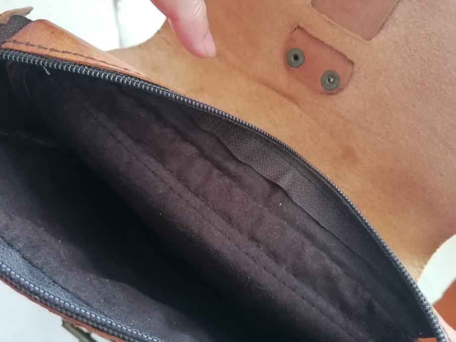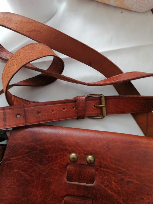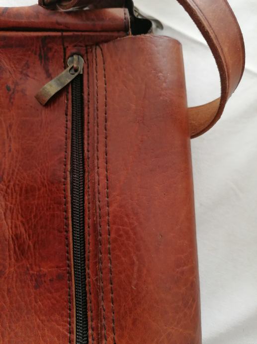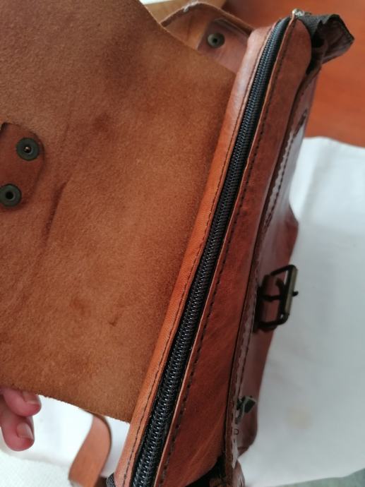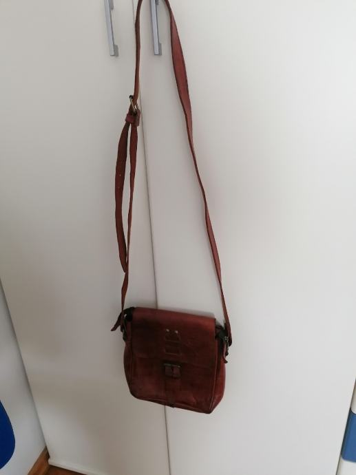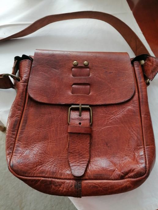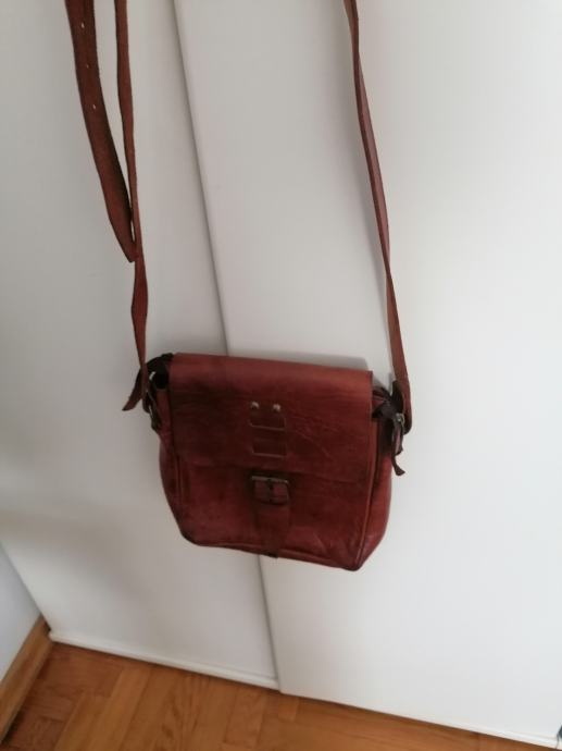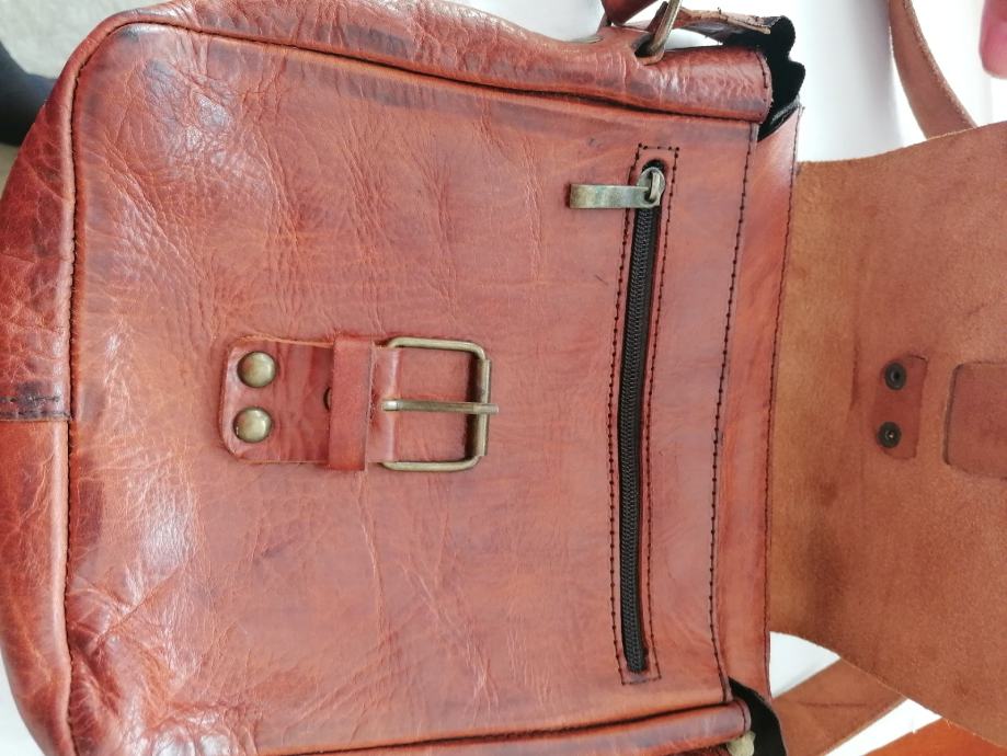 Nova kožna torbica kupljena u Maroku. Boja smeđa sa većim remenom za na rame. Ima pretinac unatra i vani sa zatvaračem. Dimenzije: visina 27cm, širina 24 cm i dubina 6 cm.