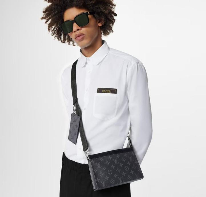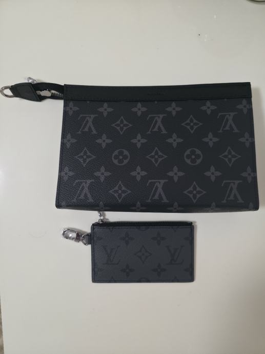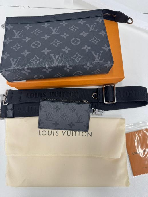 Prodajem mušku Louis Vuitton torbicu s prepoznatljivim monogramom u tamnoj boji. Torbica je potpuno nova, bez etikete i dolazi s manjim dodatnim novčanikom istog dizajna. Elegantan i praktičan modni dodatak za svakodnevno nošenje ili posebne prilike.