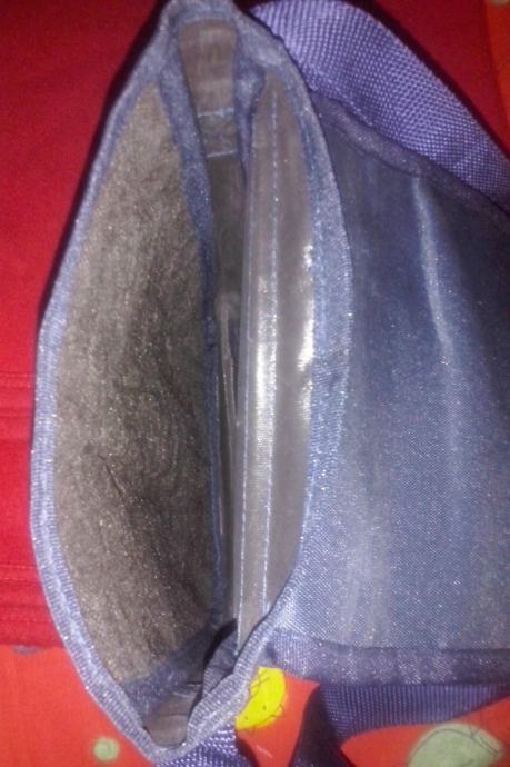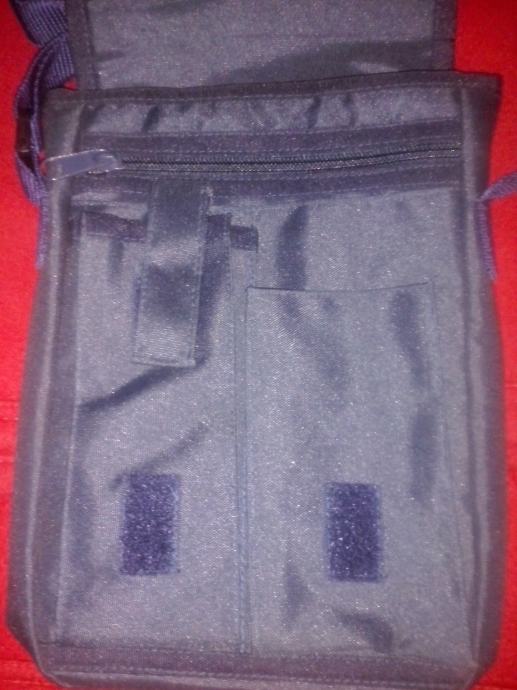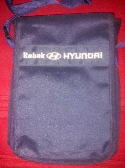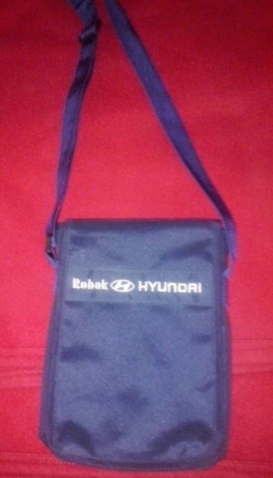 Tamnoplava torbica sa remenom za rame čije se veličina može prilagođavati. Dimenzije cca 17x23 cm. Glavni pretinac cijelom duljinom i širinom. Još jedan pretinac na cif patent i dva džepića. Otvaranje na čičak. Logotip Robak Hyundai.