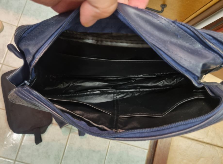 tamnoplava sa slovom V ima još plastiku od cijene brušena koža iznutra pretinac sa manjim pretincima.
