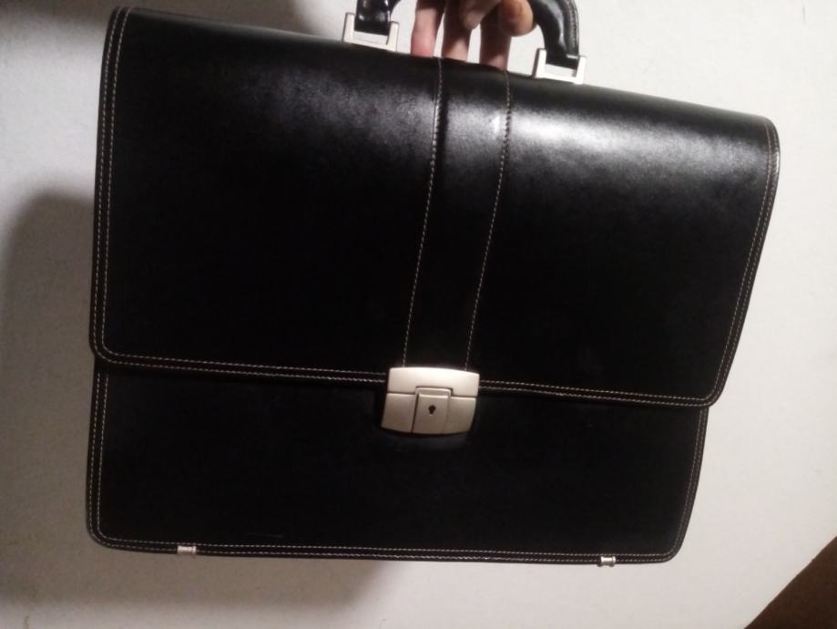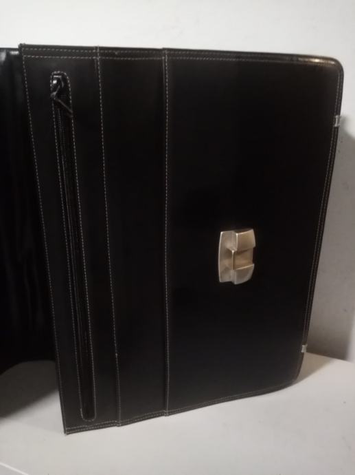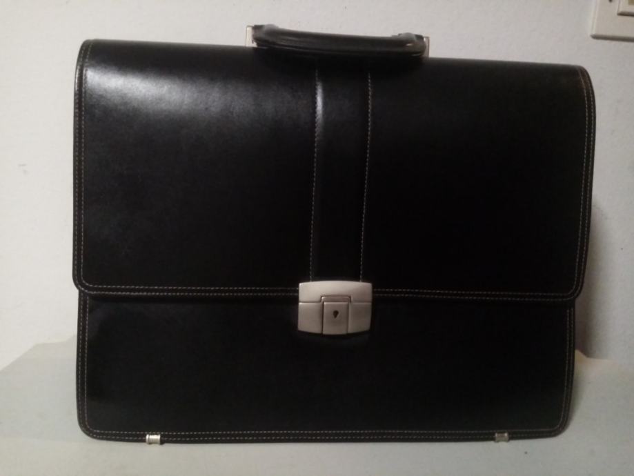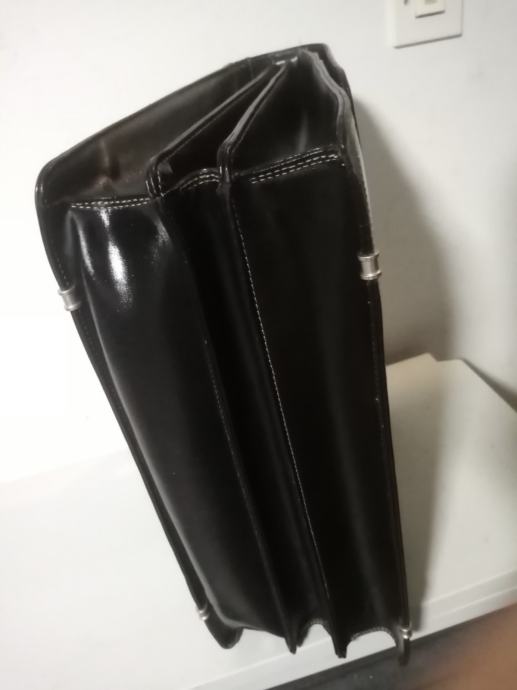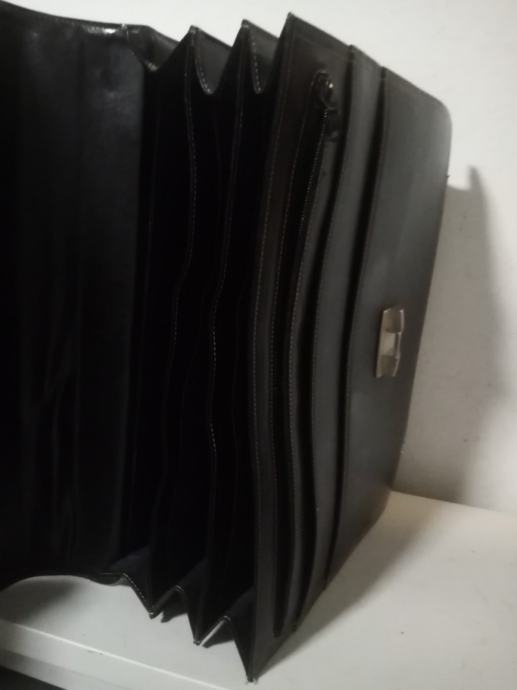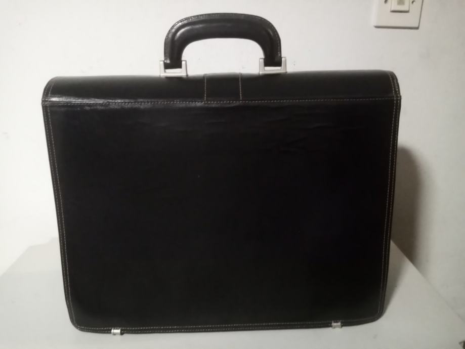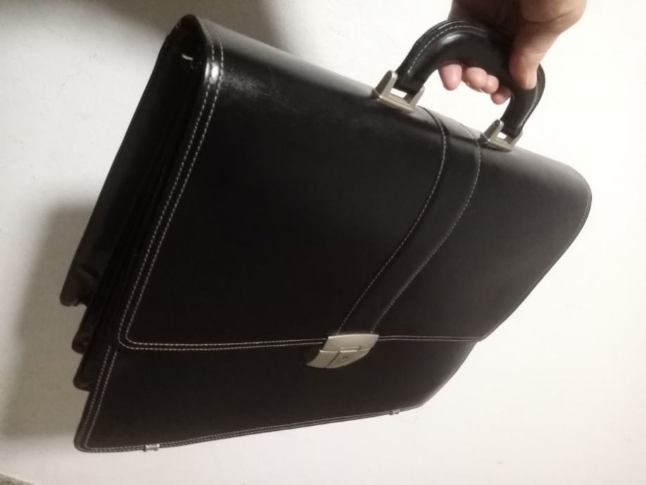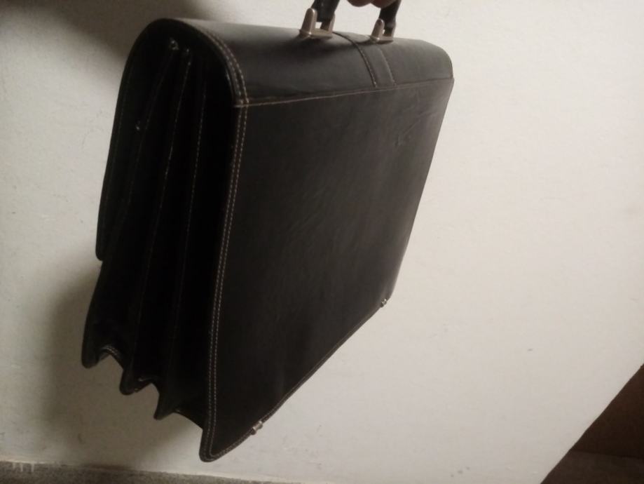 Kvalitetna, čvrsta i malo korištena crna kožna poslovna torba. Torba je prilagođena za spremanje službene dokumentacije. Ima 3 veća pretinca i na prednjoj strani 3 plitka pretinac od kojih jedan ima cif. Sa unutarnje stražnje strane ima manje pretince za mobitel olovke i osobne dokumente.