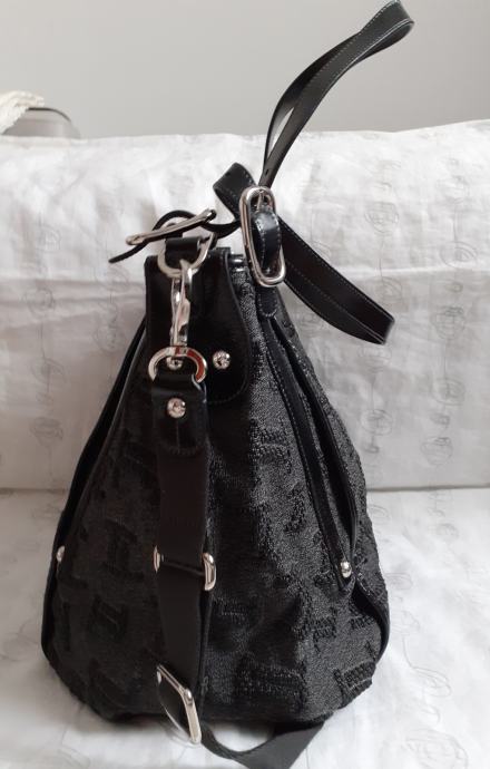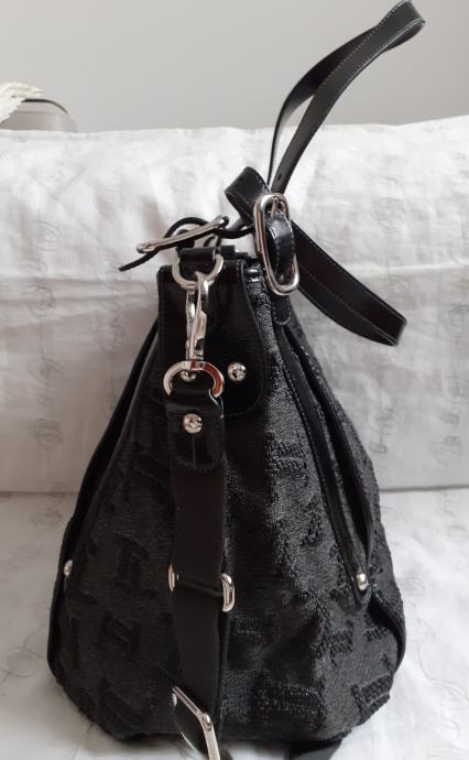 Jako atraktivna torba tamno sive boje , ručke prava lakirana koža crne boje .
