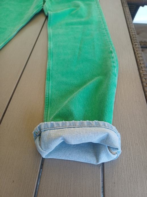 To je muški model uskog kroja (skinny fit) izrađen od denima (pamuk s malo elastana), poznatog po intenzivno obojenom "acid wash" efektu — u ovom slučaju u jarkoj kiselo zelenoj nijansi.