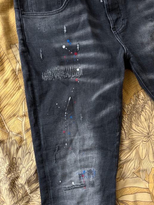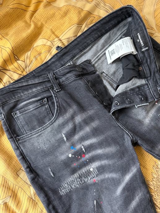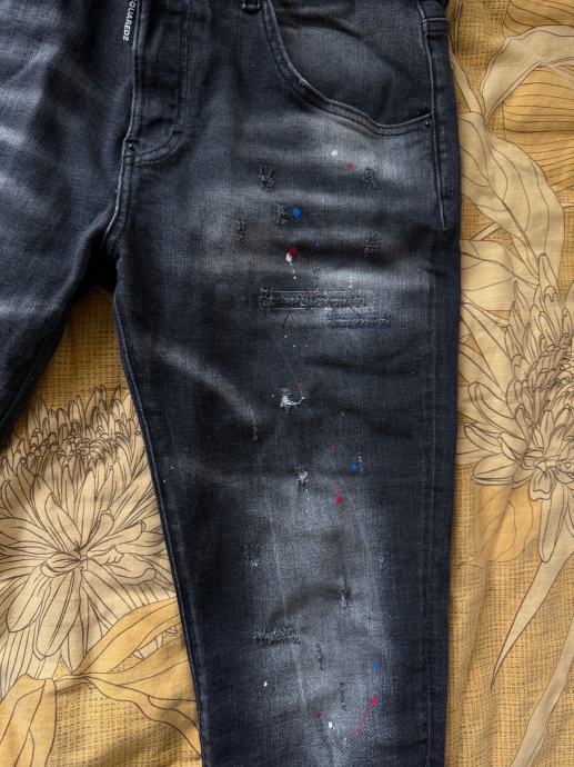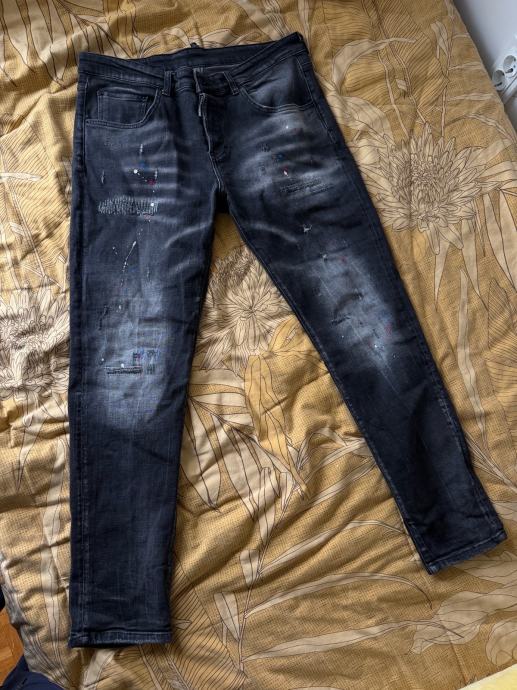 Prodajem muške Dsquared2 traperice u sivoj boji. Radi se o prepoznatljivom modelu s karakterističnim distressed detaljima, zakrpama i prskotinama boje po nogavicama, što je zaštitni znak ovog brenda. Kroj je slim, a materijal je udoban za nošenje. Veličina je L.