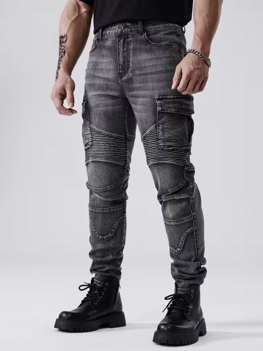 Muške rastezljive uske traperice s više džepova, modne šavove, lokomotivske hlače.
