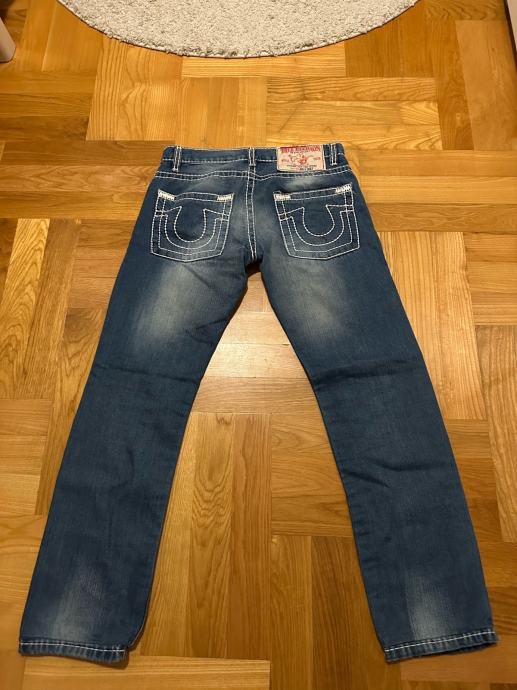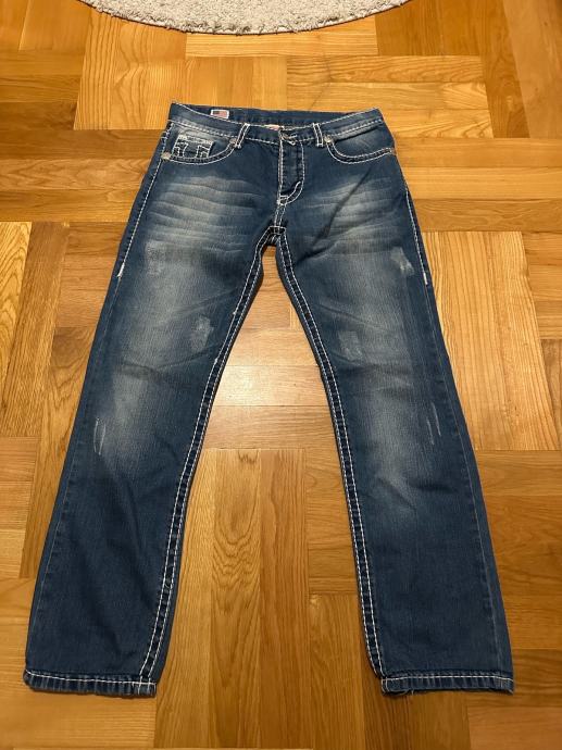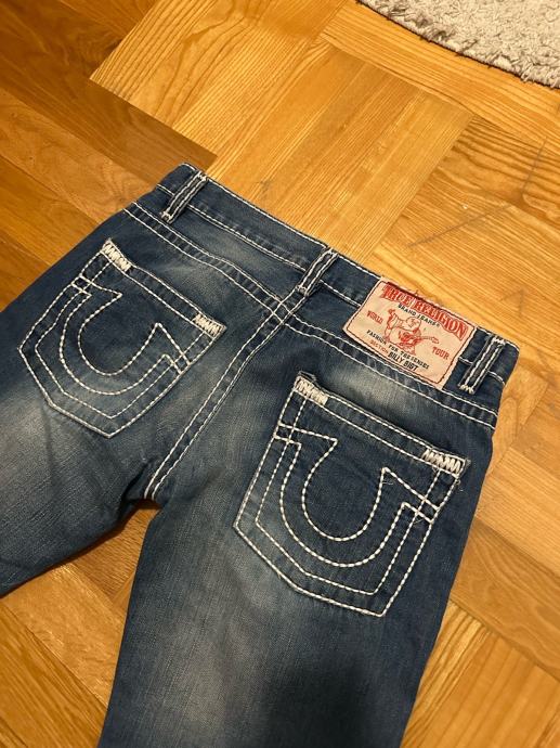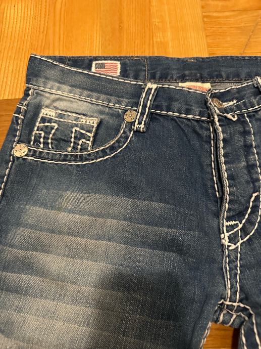 Prodajem muške True Religion traperice u tamno plavoj boji s karakterističnim debelim bijelim šavovima i prepoznatljivim logom na stražnjim džepovima. Traperice imaju lagano isprani efekt te distressed detalje na prednjoj strani. Veličina je W32 (46), kroj je ravan. Na prednjem dijelu vidljiv je američka zastavica i originalni True Religion branding.
