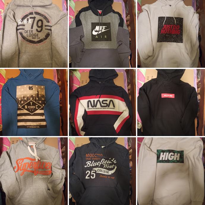 Povoljno prodajem vrlo malo korištene i u vrlo dobrom stanju hoodie sa fotografije sve veličina većinom L,a ima par i M veličina (siva Nike,bijela Just do nothing,crna)...cijena 10 € ,osim Nike sive 20€.Moguće je osobno preuzimanje u Splitu ili šaljem Tisak paketom sa kioska na kiosk.