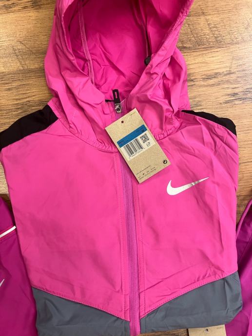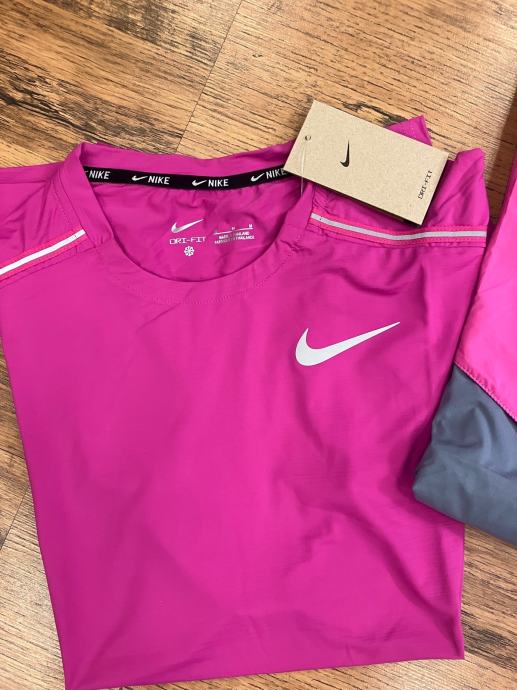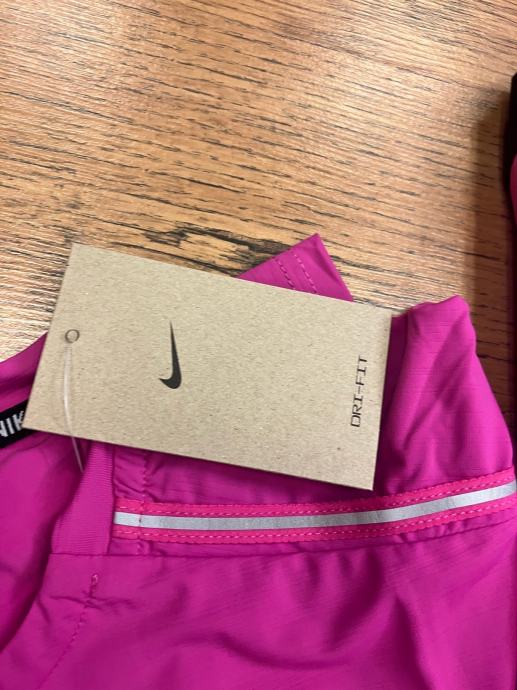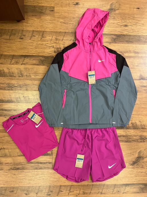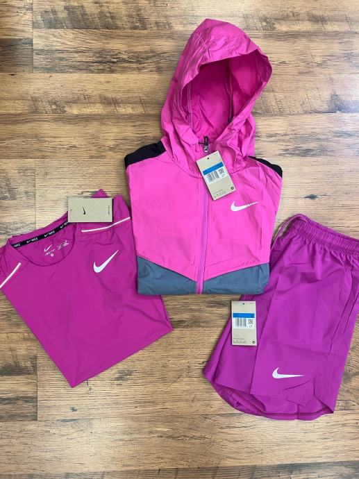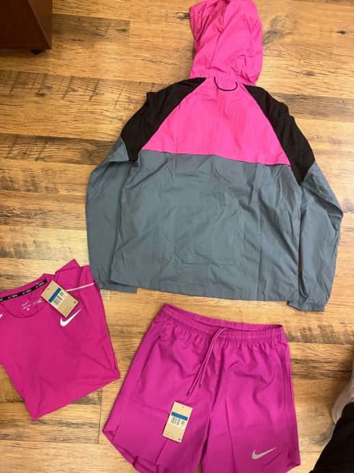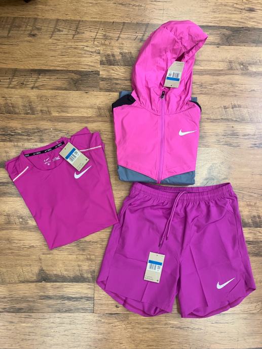 Prodajem Nike Miler set u veličini M, potpuno nov s etiketama. Set se sastoji od tri dijela: jakne s kapuljačom u kombinaciji roza i sive boje s crnim detaljima, majice kratkih rukava u tamno roza boji i sportskih šortica u istoj tamno roza boji. Svi dijelovi su od kvalitetnog materijala pogodnog za trening i aktivnosti na otvorenom. Jakna ima puni patent i džepove, majica ima caratterističan Nike Miler dizajn, a šortic ugrađene gaćice i elastični pojas. Set dolazi u roza nijansama koje se odlično uklapaju zajedno.