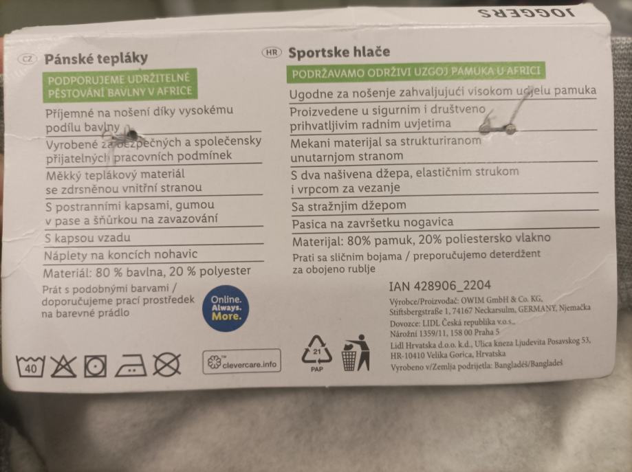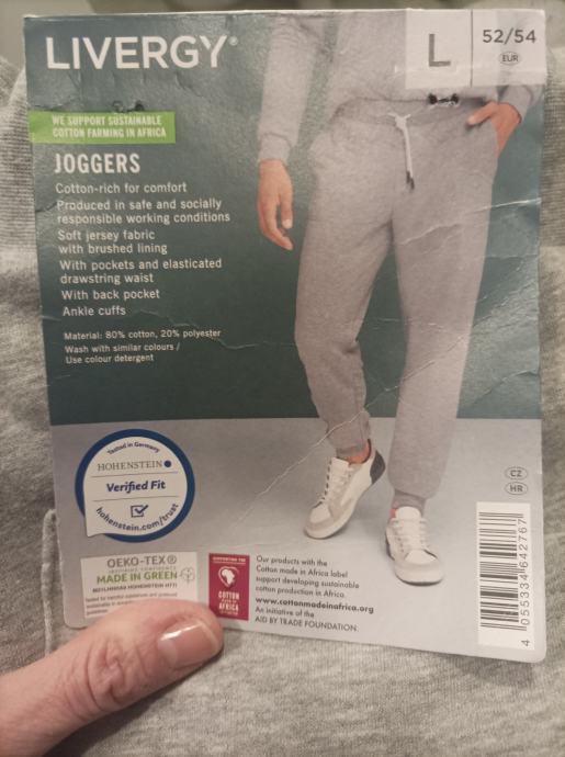 Donji dio trenirke, s toplim futerom iznutra, i vezicom u struku. Visok udio pamuka (80), ostatak je poliester (20)