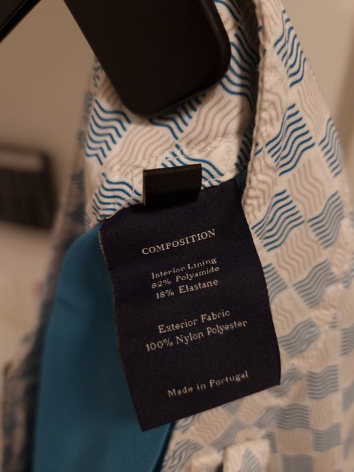 Kupaće gaće su veličine XS. Iznutra su izrađene od 82% poliamida i 18% elastina, a izvana od 100% najlon poliestera, proizvedene u Portugalu. Materijal je zbog toga na dodir iznimno ugodan, a isto se osjeća i pri nošenju. Posebnost ovih kupaćih gaća je u tome što sa svake strane imaju tzv. "side adjusters" mehanizme koji imaju svrhu remena, odnosno po potrebi stežu/otpuštaju kupaće gaće u struku radi prilagođavanja veličine.
