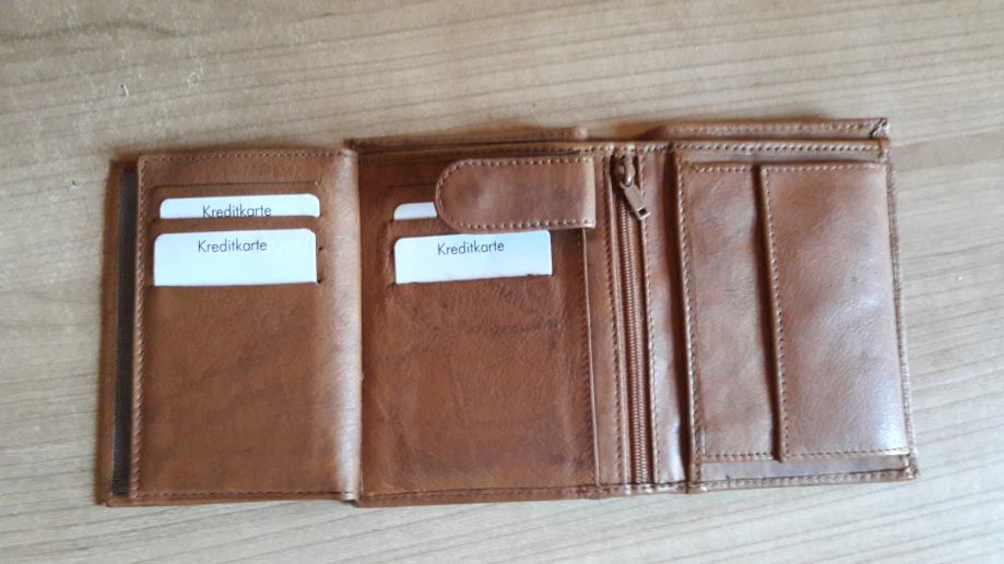 Ima dvije pregrade za novčanice, 10 utora za kartice, džep na ziper te ostale pretnice za vozačku, prometnu i druge dokumente.