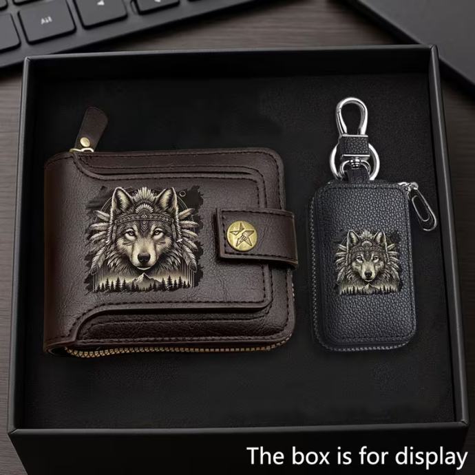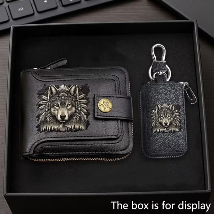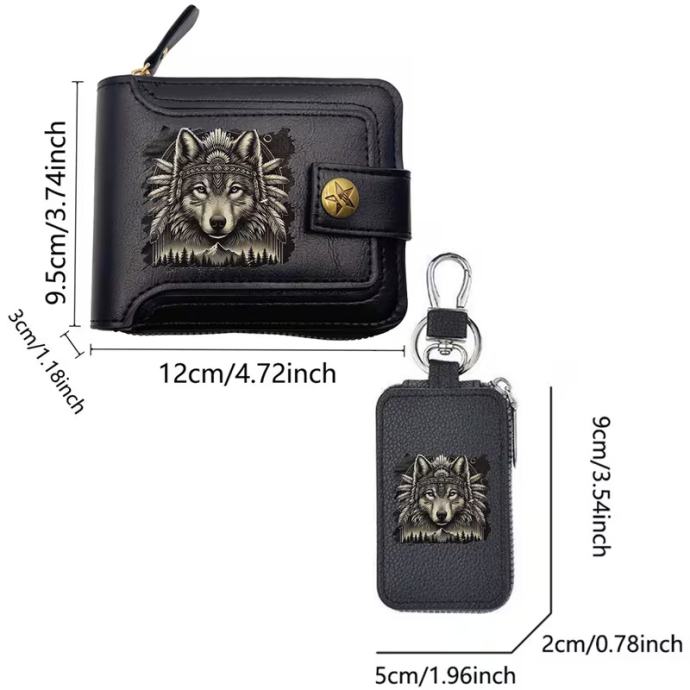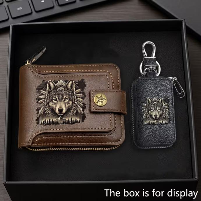 2 komada sivog vuka, modni poslovni novčanik i privjesak za ključeve | Umjetna koža, idealno za Božić, rođendan i Dan zahvalnosti