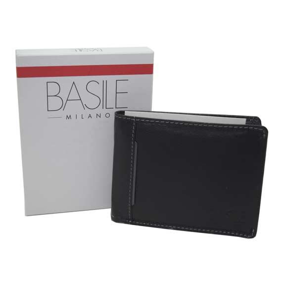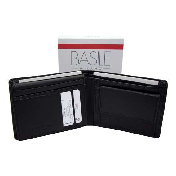 Kvalitetan kožni novčanik modne kuće "Basole Milano". Dimenzije novčanika (zaklopljenog): 12 x 9.5 cm. Novčanik posjeduje: dva velika pretinca za papirnate novčanice, četiri mala pretinca za kreditne i slične kartice, jedan okomiti preklop, jedan okomiti mrežasti džep, tri srednje velika džepa te jedan džep za sitan novac koji se zatvara pomoću metalnog dugma (drukera).