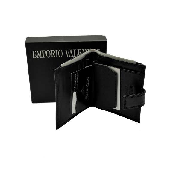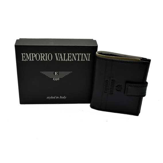 Kvalitetan kožni novčanik modne kuće "E. Valentini". Dimenzije novčanika (zaklopljenog): 10 x 8.5 cm. Novčanik posjeduje jedan veliki pretinac za papirnate novčanice, četiri mala pretinca za kreditne ili slične kartice, jedan džep za sitan novac koji se zatvara pomoću metalnog gumba (drukera) i dva srednje velika džepa.
