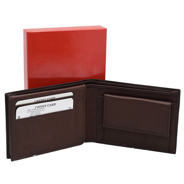 Kvalitetan muški kožni novčanik . Dimenzije novčanika (zaklopljenog): 12.5x9.3 cm. Iznutra novčanik ima 2 velika pretinca za papirnate novčanice + 4 mala pretinca za kreditne i slične kartice + 1 vodoravni preklop (za dokumente) + 1 džep za sitan novac + 2 srednje velika džepa. Novčanik je izrađen od glatke prirodne kože, jendostruko prošiven izvana.