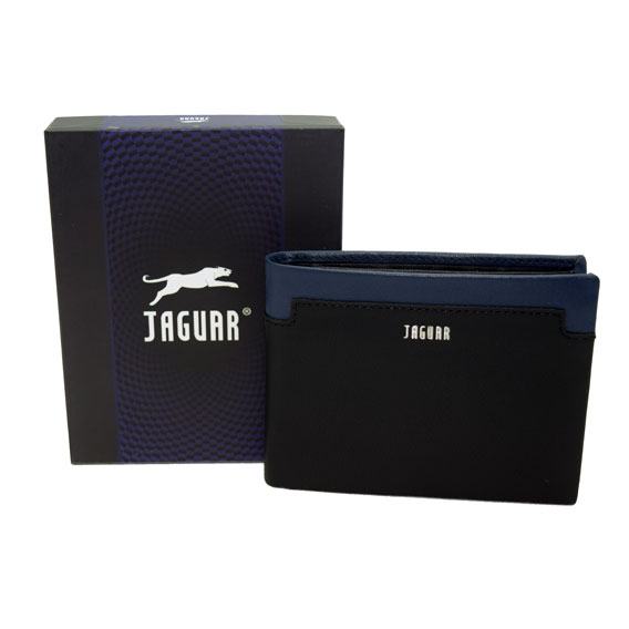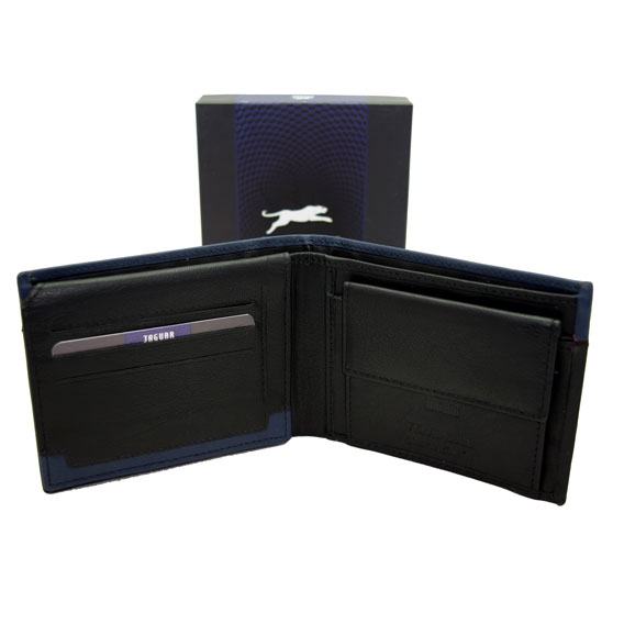 Kvalitetan kožni novčanik modne kuće "Jaguar". Dimenzije novčanika (zaklopljenog): 12.5 x 9.5 cm. Novčanik posjeduje: dva velika pretinca za papirnate novčanice, osam malih pretinaca za kreditne i slične kartice, jedan okomiti preklop, jedan okomiti mrežasti džep, tri srednje velika džepa te jedan džep za sitan novac koji se zatvara pomoću metalnog dugma (drukera).