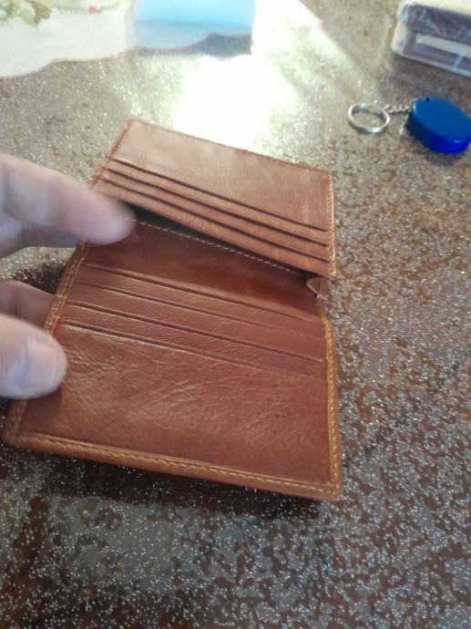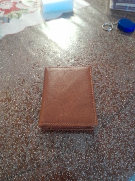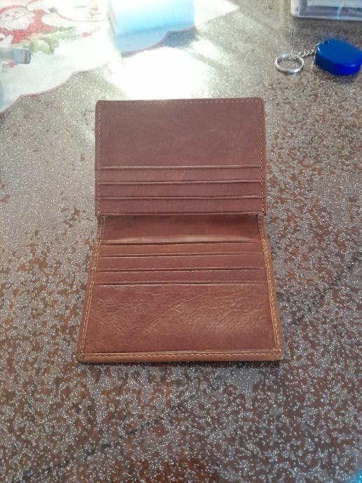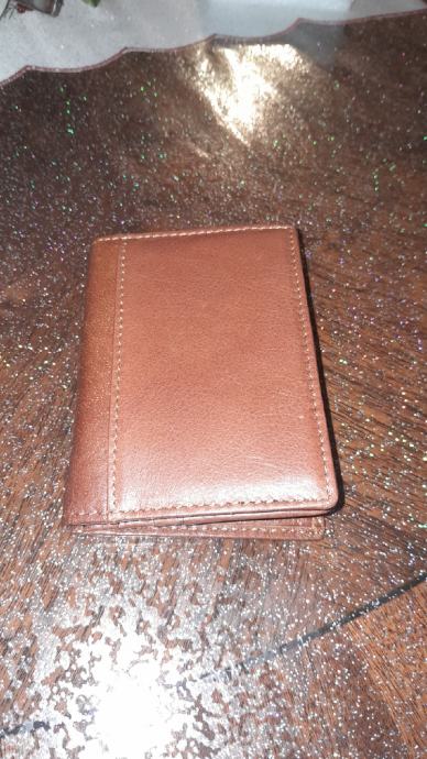 Novi kožni novčanik u smeđoj boji,za kreditne kartice ,dokumente jedan širi pretinac za novac.Dimenzija8x11 cm.Od prave kože
