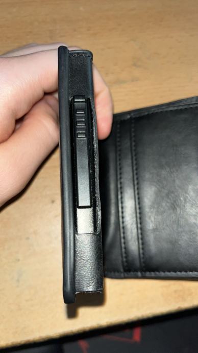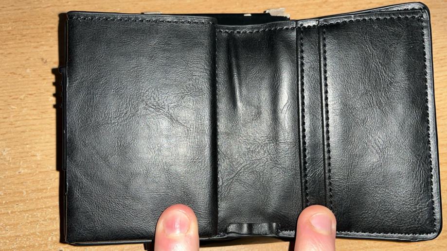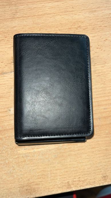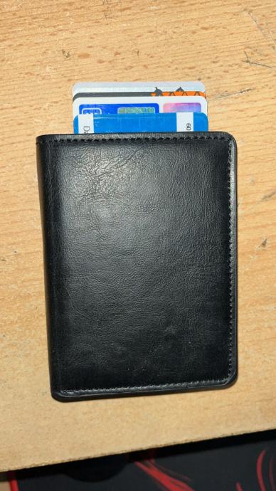 -Prodajem novčanik sintetičkog materijala izgleda kože s mehanizmom za izbacivanje kartica (kao na slici), i novčanik može ukupno 10 kartica držati, 8 u mehanizmu i 2 unutar. Također ima dovoljno prostora da drži i novčanice.