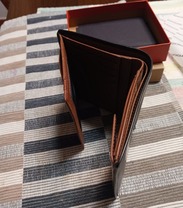 Prodajem muški kožni novčanik smeđe boje s smeđom unutrašnjošću. Novčanik je kompaktnog, klasičnog dizajna s više pretinaca za kartice i prostorom za novčanice. Izvana se nalazi diskretan logotip branda u donjem kutu. Stanje je novo bez etikete.
