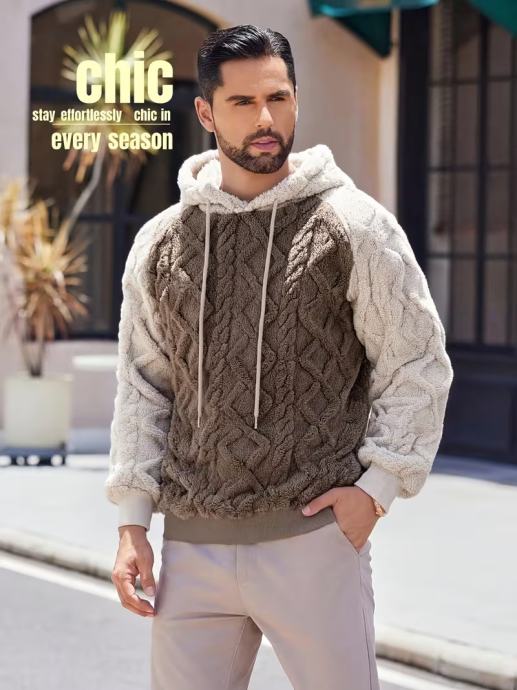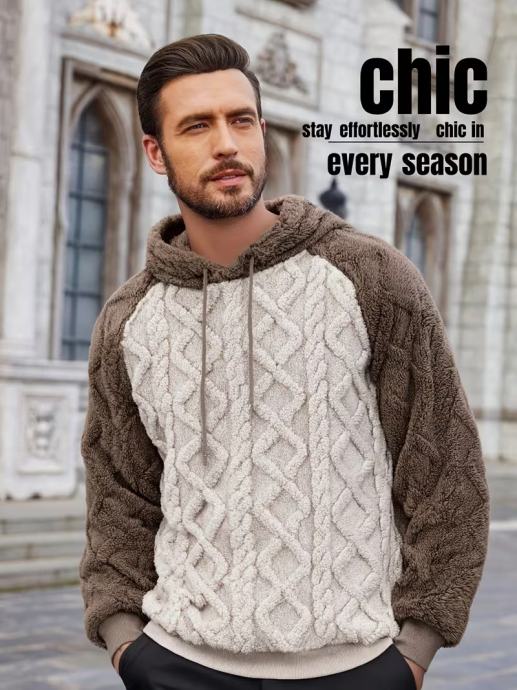 Muški plišani topli pleteni pulover dugih rukava u boji | S kapuljačom, široki kroj, za sva godišnja doba, stil za odmor.