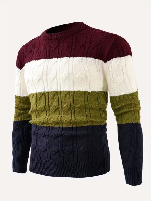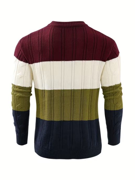Muški zimski topli džemper s okruglim izrezom - Pleteni džemper s višebojnim blokovima (kestenjasta/bijela/tamnoplava/crna/siva/zelena/bež) - Debela tekstura, ležerna i formalna uredska odjeća - Udoban džemper za muškarce koji se može prati u perilici rublja - Jesensko-zimska odjeća s kontrastnim dizajnom blokova boja, rebrastim manžetama i rubom, opuštenim krojem za slojevito nošenje, Zimski džemperi za muškarce, Muški pleteni džemper većih veličina, Muški pleteni džemper većih veličina, Zimski muški džemperi, Džemper s pletenim uzorkom