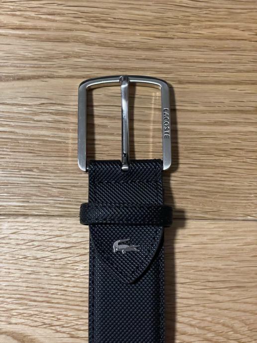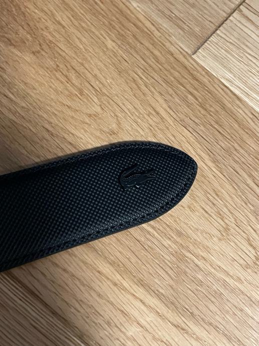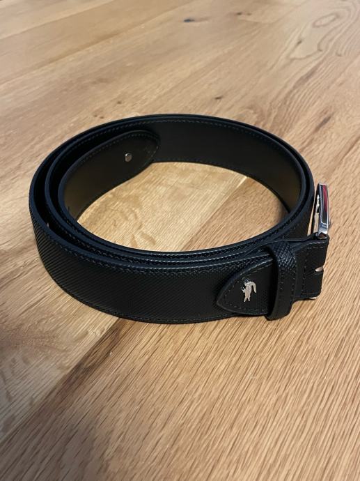 Prodajem Lacoste muški remen u crnoj boji, dužine 110 cm. Remen je izrađen od PVC materijala s prepoznatljivom teksturiranom površinom i srebrnom kopčom. Karakterističan Lacoste logo krokodila prisutan je na remenu. Remen je nov, bez etikete. Kupljeno na BestSecretu, imam račun. Nikad nošeno, razlog ne nošenja i prodaje je to što je prevelik.